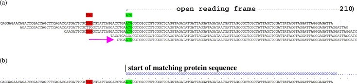 Fig. 6. Creation of a unique full-length set. (a) The determination of the full-length representative in an EST cluster. 5â² sequenced ESTs from the X. tropicalis neurula and gastrula stage cDNA libraries that are 99% similar over a length of 100 nucleotides were aligned and clustered. Open reading frames of at least 210 base pair were identified. In order to ascertain that clusters contain full length EST clones in at least 2 and at least 50% of the EST clones at the same position a start codon (green) must be preceded by an in frame stop codon (red). To avoid 5â² UTR dependent negative translational control an EST with the shortest 5â²UTR (arrow) was chosen as a full-length representative of the cluster/gene and re-arrayed into the unique and full-length set. (b) Criteria for selecting singletons as full-length. EST clones that did not align with any other clones were classified as singletons. Only singletons that contained a long ORF with a start codon preceded by a stop codon were considered for the full-length set. However, since the 50% rule (see above) cannot be applied in this case, Blast information was also used to determine if a singleton is full length. Only if the translational start of a matching protein in the database matched the start codon of the singleton, the latter was included in the full-length set. |