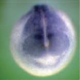 zgpat (zinc finger, CCCH-type with G patch domain) gene expression in Xenopus tropicalis embryos, NF stage 11, as assayed by in situ hybridization. Vegetal view: dorsal up. |
