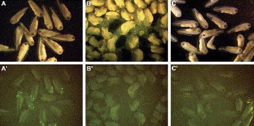 morphology. (A00) Embryos viewed under UV illumination to identify GFP-expressing embryos. (A and A0) Eggs were fertilized with transgenic sperm and