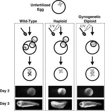 embryos are created by the fertilization of the eggs by UV-irradiated sperm