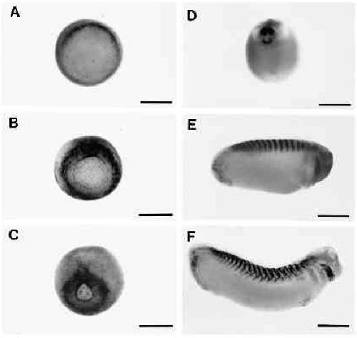 Fig. 4. Whole-mount in situ hybridization with a Xwnt-11 probe on embryos of different stages. (A) Late blastula (stage 9), vegetal view,