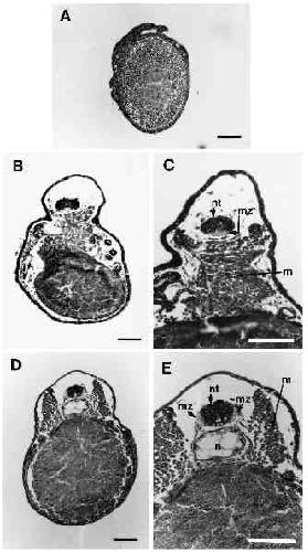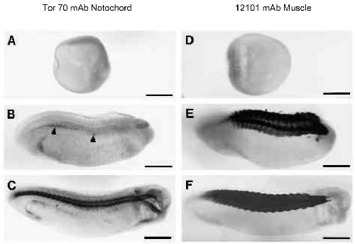 somitic muscle but no notochord. Normal control embryos have both muscle and notochord. (A-C) Incubated with the notochord-specific