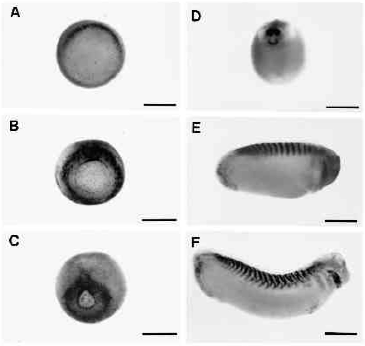 Fig. 3. In situ hybridization to sectioned tissue from oocytes and embryos. Middle and late stage oocytes were oriented during embedding