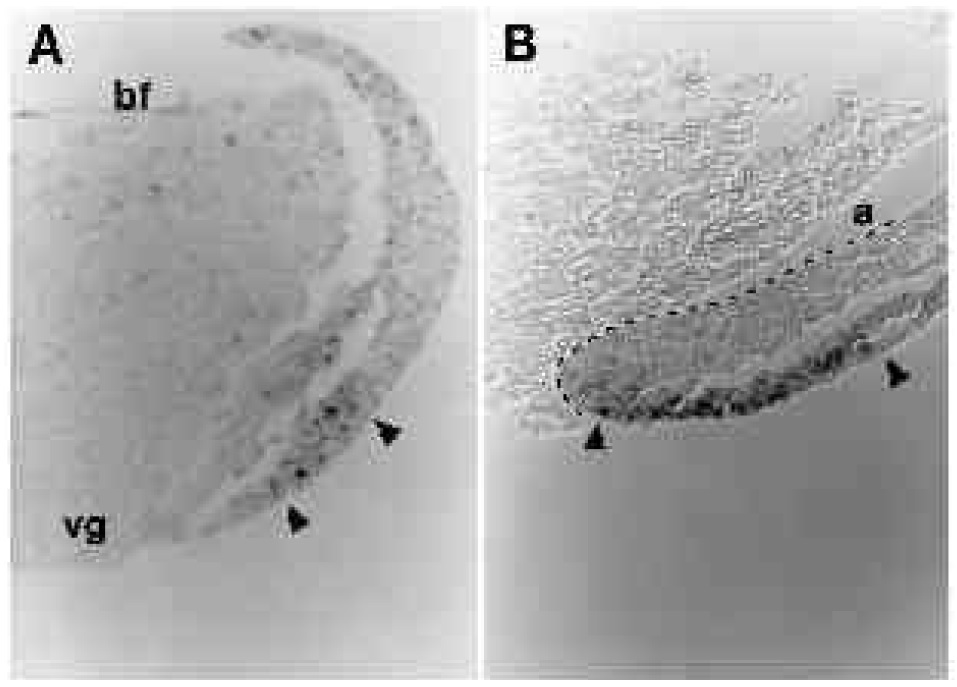 from posterior-ventral side, dorsal is up. The blastopore is almost completely closed and is visible only as a small slit. Xwnt-11 expressing