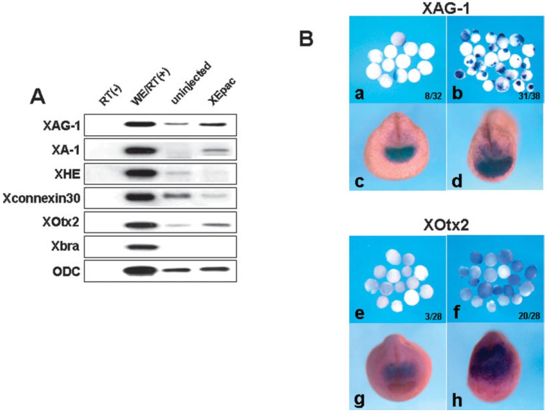 control; WE, whole embryo. B: XEpac induces XAG-1 and XOtx2 in naive ectoderm and