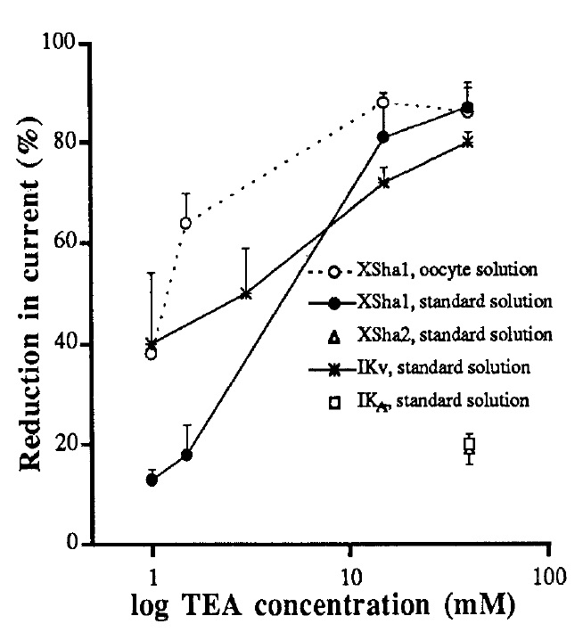 Figure 4. TEA sensitivity of XShal-induced current in oocytes. The current is efficiently blocked by TEA, in particular in the presence of