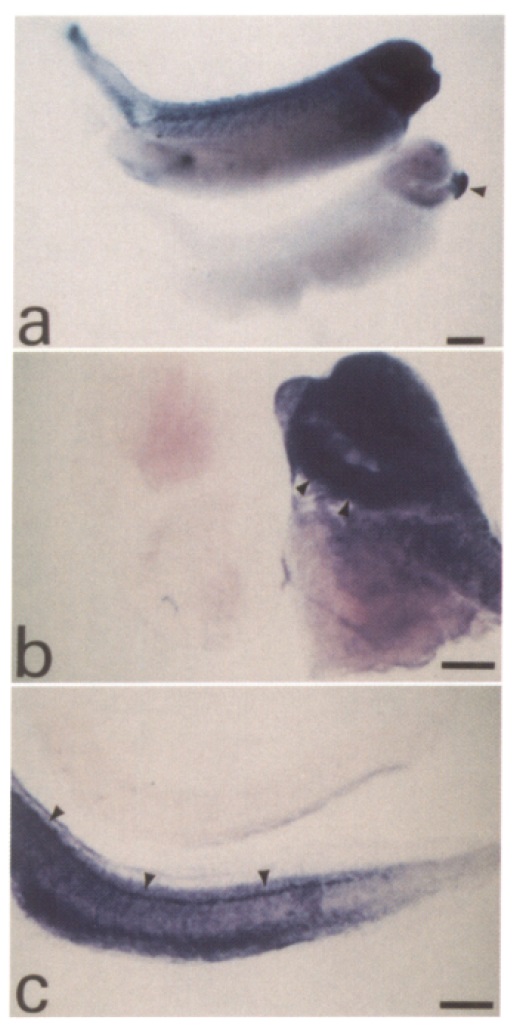 XShal signal. b, In the head, both the brain and the gill area (arrowheads) show intense staining. c, Along the length of the spinal cord, the dorsal