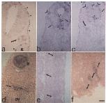 dorsal and ventrolateral aspects of the spinal cord. Occasionally in controls, the cement gland (arrowhead) showed background staining. However,