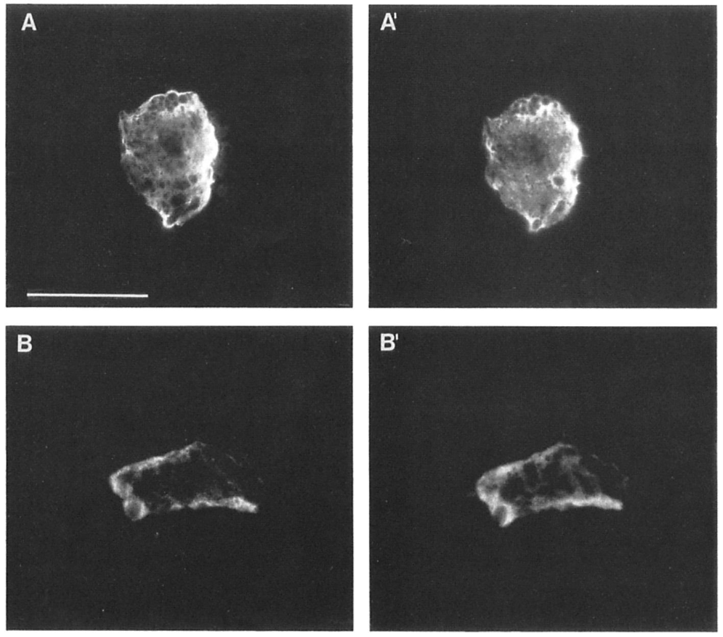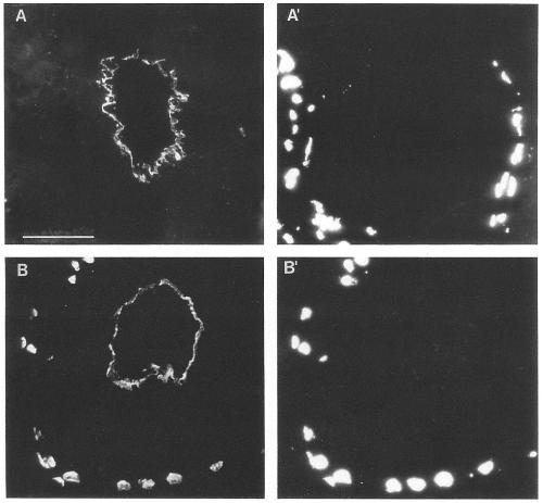 with antilamin Lm antibody 46F7 (A) or antilamin Lu antibody X223 (B). Chromatin staining (A~ B') by HOECHST. Bar, 50um.