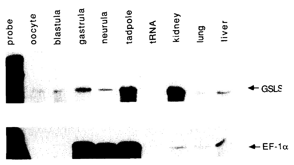 We have isolated a cDNA clone from a Xenopus laevis tadpole cDNA library which probably codes for the large subunit of glutathione synthetase. The corresponding protein comprises 474 amino acids and shows a significant homology with the large subunit of glutathione synthetase of Schizosaccharomyces pombe. RNase protection experiments revealed that the gene is transcribed during oogenesis and that zygotic expression starts after midblastula transition. Transcripts are also detected in various adult tissues suggesting an ubiquitous distribution of the corresponding protein.