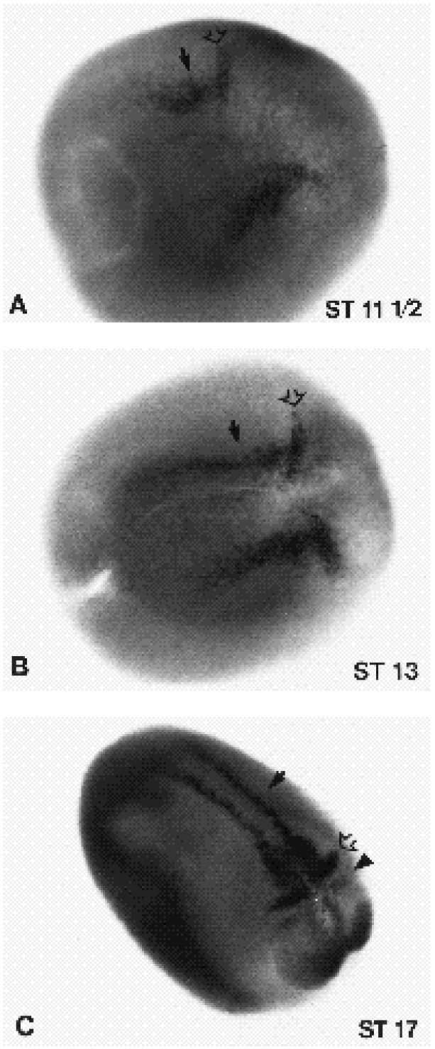 stage embryos. XASH3 (A,B,C) and N-CAM (D,E) expression in stage 14 embryos was determined by whole-mount in situ hybridization (A,D). Cross-sections of similarly staged embryos are also shown (B,C and E). Open arrow in A indicates XASH3 expression lateral to the neural plate; closed arrow indicates the mediolaterally restricted stripe revealed by crosssection in B, and the arrowhead indicates the transverse âeyebrowâ stripe revealed by cross-section in C. In A, anterior is towards 11 oâclock and, in D, it is towards 1 oâclock. Note the restricted expression of XASH3 along the mediolateral axis of the neural plate (B) in comparison to that of N-CAM (E).