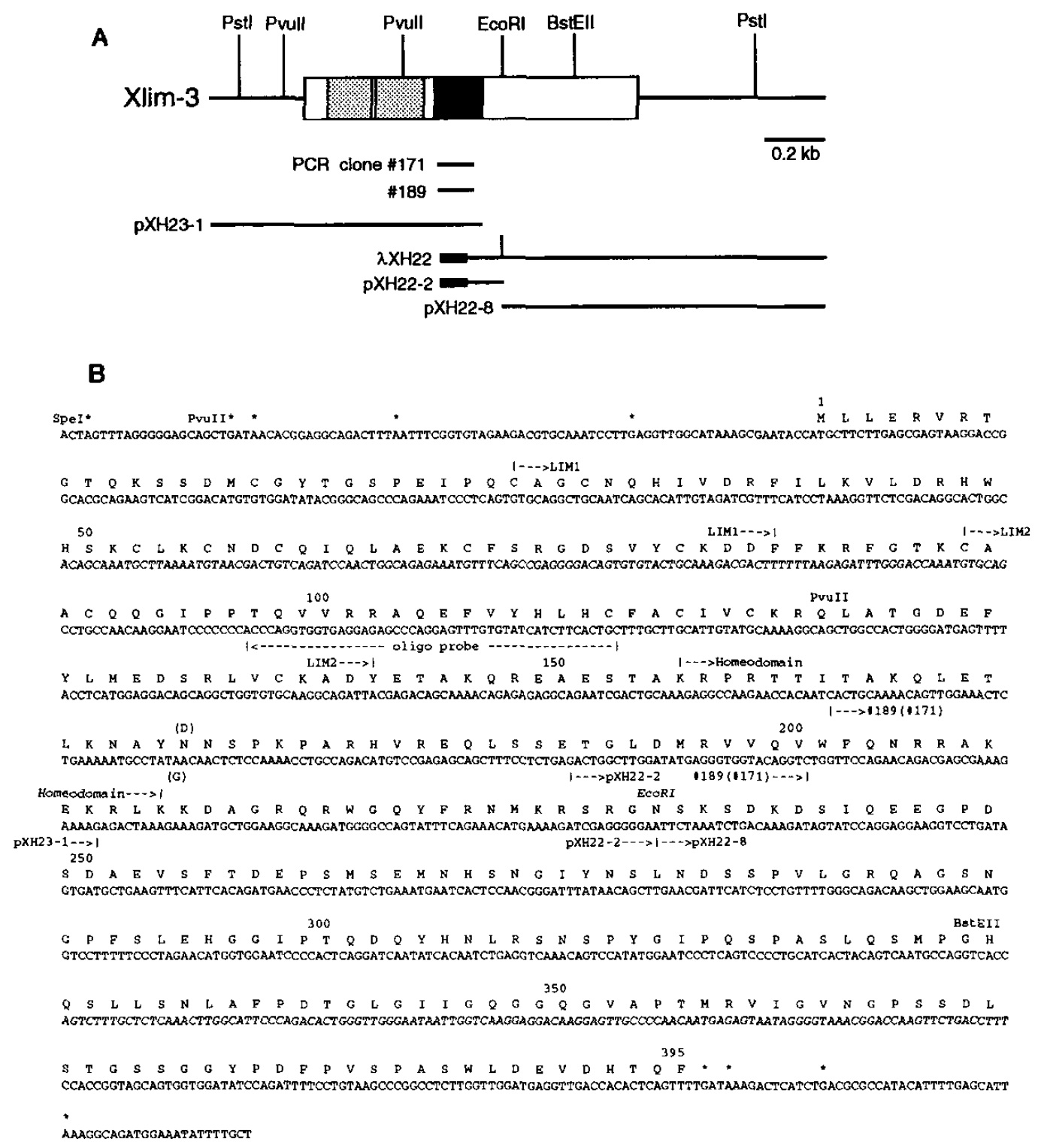 FIG. 1. eDNA clones and nucleotide sequence of Xlim-8. (A) Schematic representation of the cDNAs. Top: thin line, noncoding region; box,