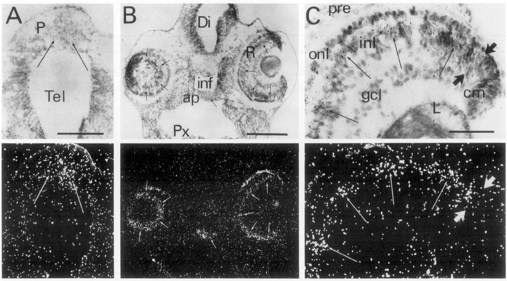 micrograph showing bilateral Xlim-3 gene expression in retina and more medially in the anteriorpituitary (ap), dorsal to pharynx (Px), ventral to the