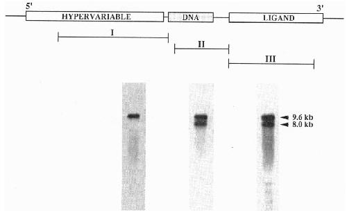 used in Northern analyses (Lower) are indicated. Probe I is a 1.1-kb cDNA fragment confined entirely to the 5' hypervariable or A/B domain