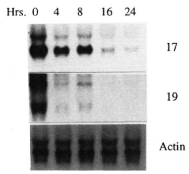 genes (17 and 19) in tadpole tails assayed by Northern blot.