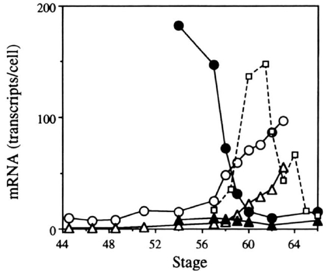 to gene 8. Developmental expression of genes 14 and B is similar to