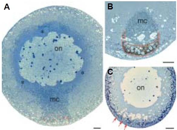 Abbreviations: mc, mitochondrial cloud; on, oocytenucleus. Bars, 50 μm.
