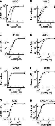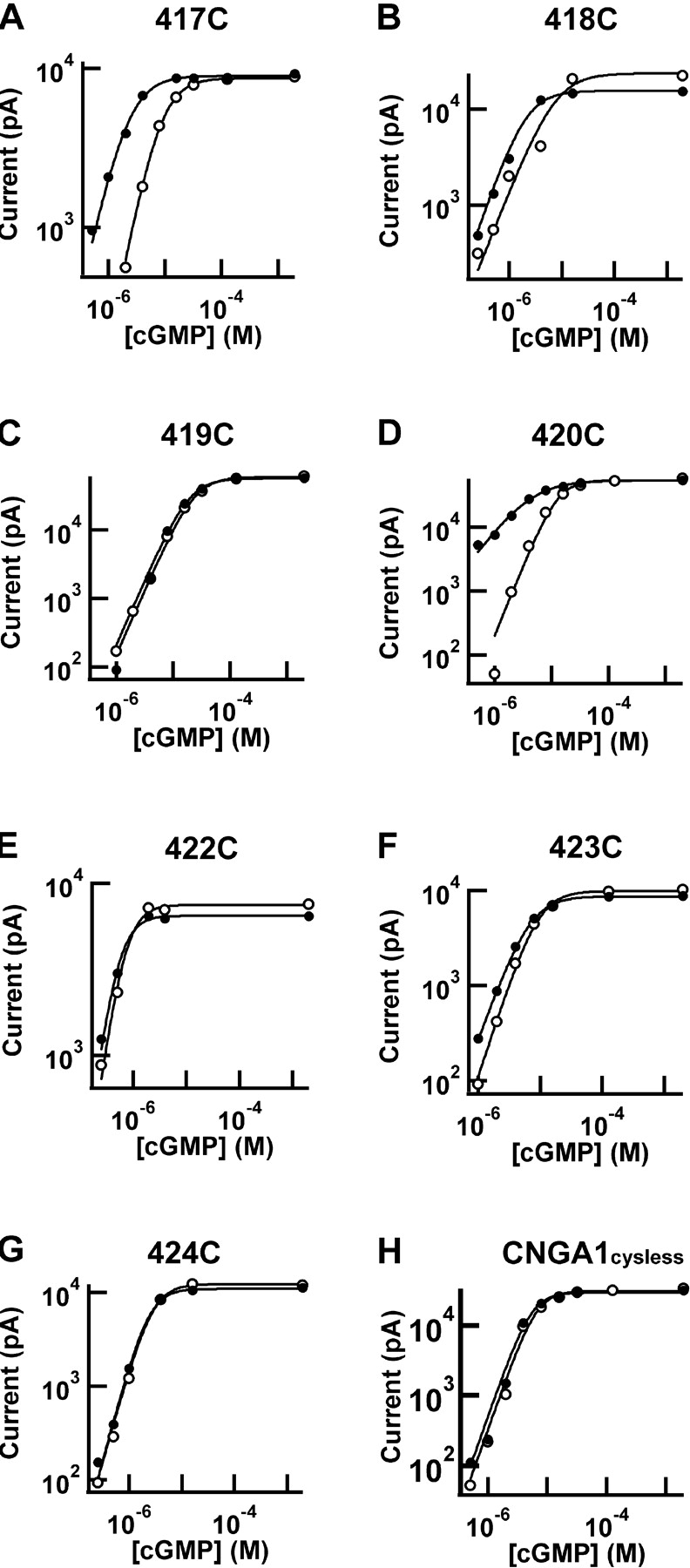 Figure 2. . Cu/P induced potentiation in three of the seven cysteine mutants. Dose–response curves of cysteine mutants and CNGA1cysless activated by cGMP initially (open circles) and after (filled circles) treatment with Cu/P plus 2 mM cGMP. Smooth curves represent fits with the Hill equation (see materials and methods), with mean K1/2 values listed in Table I.