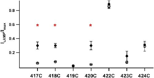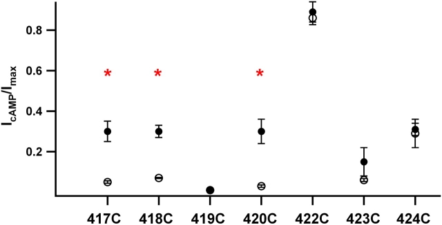 Figure 3. . Cu/P effect on the current activated by saturating cAMP. Fraction of the current activated by 20 mM cAMP versus 2 mM cGMP (IcAMP/Imax) initially (open circles) and after Cu/P treatment (filled circles). Points represent the mean, with error bars representing the SEM. Patch numbers range from 4 to 8. Red * denotes a statistical difference of P < 0.01 (Student's t test) between the initial data and that after Cu/P treatment.