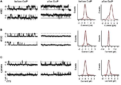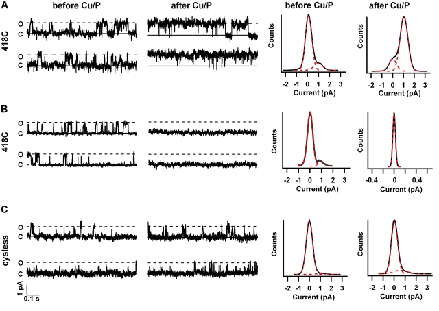 Figure 5. . Cu/P produced two populations of channels in 418C. Single channel currents measured at +50 mV were recorded before and after a 10-min treatment with Cu/P plus 2 mM cGMP for 418C (A and B) and CNGA1cysless channels (C). For 418C, 4 μM cGMP was used to activate the channels, and for CNGA1cysless, 2 μM cGMP was used to activate the channels. All-points histograms were made from the data collected under each condition (right, in all cases >5 s of data was used).
