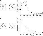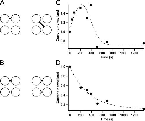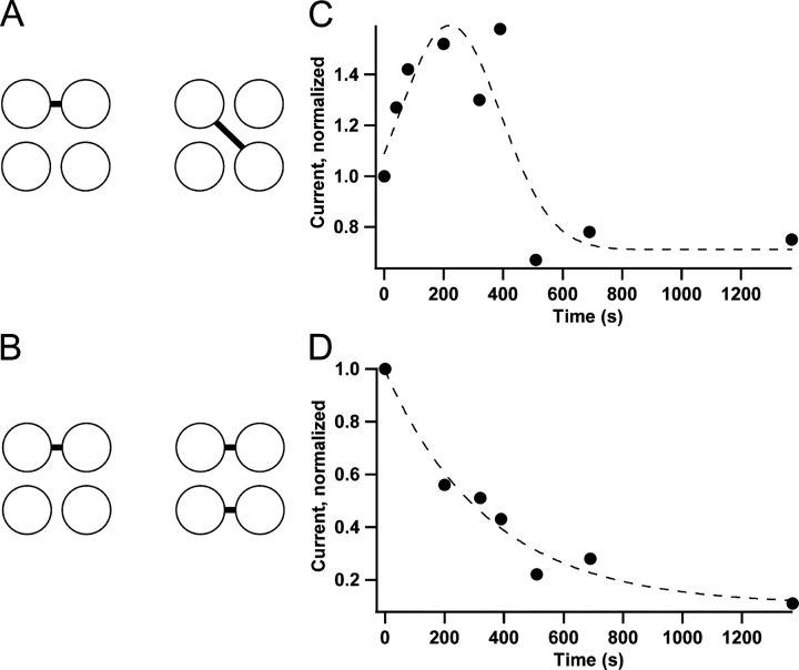 Figure 6. . Mechanisms of the dual effects of Cu/P on 418C. (A) Disulfide bonds formed between opposite and adjacent subunits could produce different effects. (B) The number of disulfide bonds could determine whether potentiation or inhibition would be observed. (C and D) Kinetics of the Cu/P effect on 418C with currents activated by either (C) 2 μM cGMP or (D) 2 mM cGMP. The smooth curves represent Gaussian fits (C) and exponential fits (D).