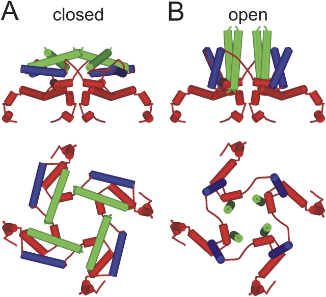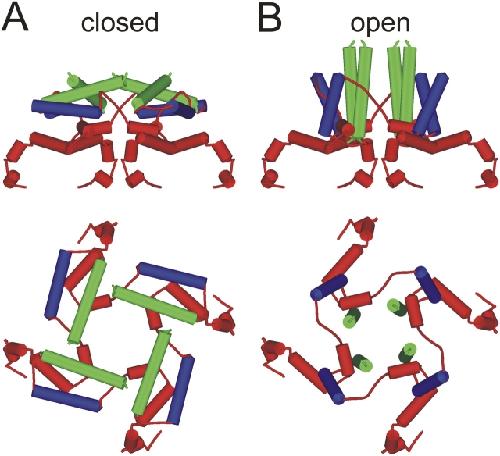 Figure 7. . Cartoon model of closed and open channels. Side (top) and top (bottom) views of the CNGA1 C-linker made from the HCN2 structure (A) and from a model based on our data (B). The A' helices are shown in green and the B' helices are shown in blue. A and B differ only by the conformation of the B'-C' loop.