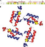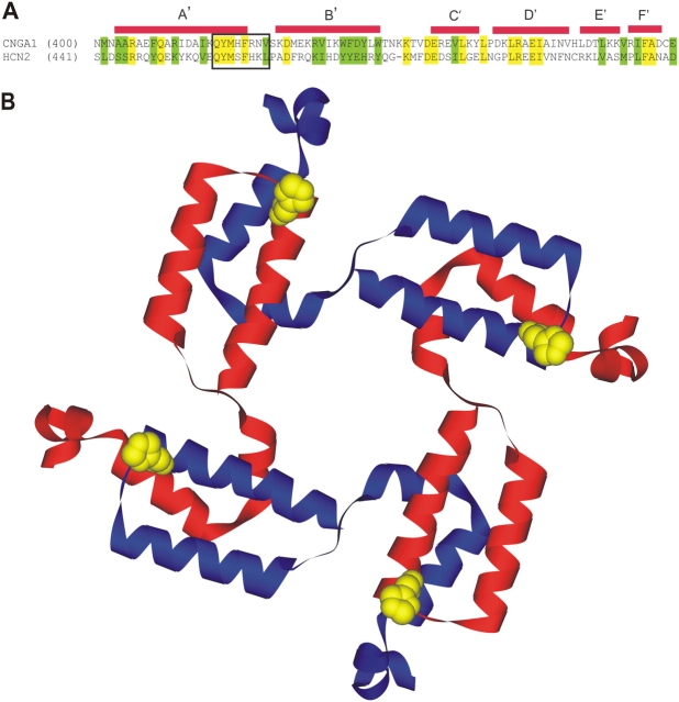 Figure 1. . Sequence alignment of the C-linker regions between CNGA1 and HCN2 and structural model of the C-linker regions of CNGA1. (A) Sequence alignment of the C-linker regions between CNGA1 and HCN2. Green indicates conserved sequence and yellow indicates identical sequence. The square indicates the cysteine mutation region. (B) Structural model of CNGA1 C-linker based on the crystal structure of HCN2 channel COOH termini, with red and blue used to show alternate subunits. The model was built using the software Swiss-PDB viewer in conjunction with the Swiss-Model protein modeling server (Guex and Peitsch, 1997). The yellow residues indicate 420H in each subunit. The distance between 420H is 35.12 Å for adjacent subunits, and 50.18 Å for opposite subunits.