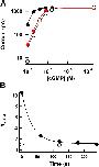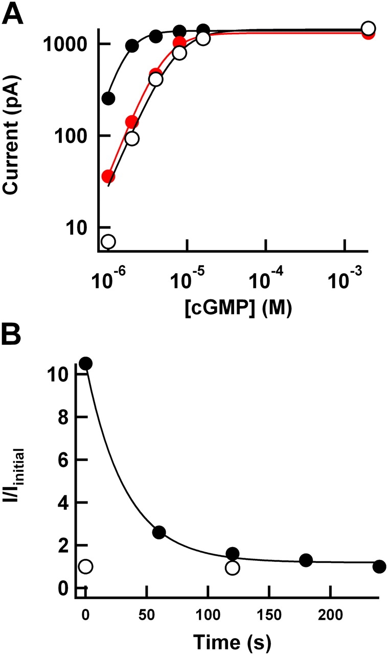 Figure 4. . DTT reversed the effect of Cu/P treatment. (A) DTT reversed Cu/P potentiation of 417C. cGMP dose–response curves initially (open circles), after a 5-min treatment with Cu/P plus 128 μM cGMP (black circles), and after treatment with 5 mM DTT + 64 μM cGMP for 10 min (red circles). The smooth curves are fits with the Hill equation, with the following parameters: initially K1/2 = 7.04 μM, Hill slope = 2.0 (black curve, right), after Cu/P K1/2 = 1.61 μM, Hill slope = 2.8 (black curve, left), after DTT K1/2 = 5.03 μM, Hill slope = 2.2 (red curve). (B) Time course of DTT reversing the potentiation effect of Cu/P on 417C. Normalized currents activated by 2 μM cGMP (black circles) and 2 mM cGMP (open circles) at +100 mV after a 5-min treatment with Cu/P plus 128 μM cGMP, and then various cumulative time in 5 mM DTT plus 64 μM cGMP. Smooth curve represents single exponential fit of the data, with time constant = 37.0 s.