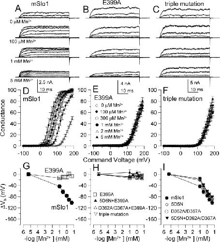Figure 2. . The ability of Mn2+ to activate BK current depends on the E399 low affinity site. (A–C) Currents resulting from Slo1 (A), E399A (B), and the triple mutation (C, 5D5N + D362AD367A + E399A) were activated as in Fig. 1. (D–F) G–V curves were generated over [Mn2+]i from 0 to 5 mM for Slo1 (n = 6), E399A (n = 5), and the triple mutation (n = 5). Open diamonds, 0 μM; filled diamonds, 100 μM; open circles, 300 μM; filled circles, 1 mM; open triangles, 2 mM; filled triangles, 5 mM. (G) Activation ΔVh is plotted versus [Mn2+]i for Slo1 (n = 6) and E399A (n = 5). (H) Activation ΔVh is plotted versus [Mn2+]i for mutants containing E399A (5D5N + E399A, n = 4; D362A/D367A + E399A, n = 6; triple mutation, n = 5). (H) Activation ΔVh is plotted versus [Mn2+]i for Slo1 and mutants not containing E399A (5D5N, n = 5; D362A/D367A, n = 7; 5D5N + D362A/D367A, n = 8). |