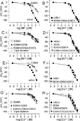 Figure 3. . Effects of Ni2+ and Co2+ are disrupted by the E399A mutation. (A) Activation ΔVh is plotted as a function of [Ni2+]i for Slo1 (n = 4) and E399A (n = 6). (B) Activation ΔVh is plotted as a function of [Ni2+] for Slo1 and the construct with mutation of both high affinity sites (5D5N + D362A/D367A, n = 5). (C) Activation ΔVh is plotted as a function of [Ni2+]i for all mutants containing E399A (5D5N + E399A, n = 6; D362A/D367A + E399A, n = 5; triple mutation, n = 6). (D) Activation ΔVh is plotted as a function of [Ni2+] for all constructs with an intact E399 (5D5N, n = 5; D362A/D367A, n = 9; 5D5N + D362A/D367A, n = 5). (E–H) Activation ΔVh is plotted as a function of [Co2+] for combinations of constructs identical to those in A–D. mSlo1, n = 5; 5D5N, n = 5; D362A/D367A, n = 4; E399A, n = 4; 5D5N + D362A/D367A, n = 5; 5D5N + E399A, n = 6; D362A/D367A + E399A, n = 5; triple mutation, n = 4. |