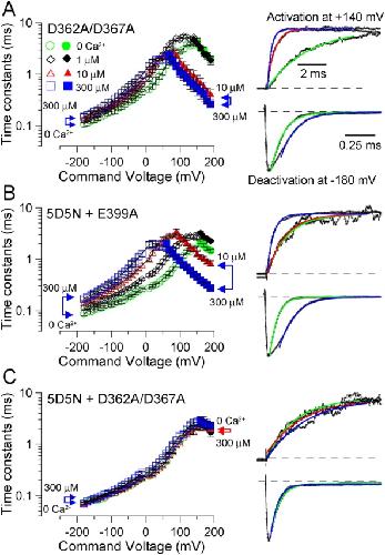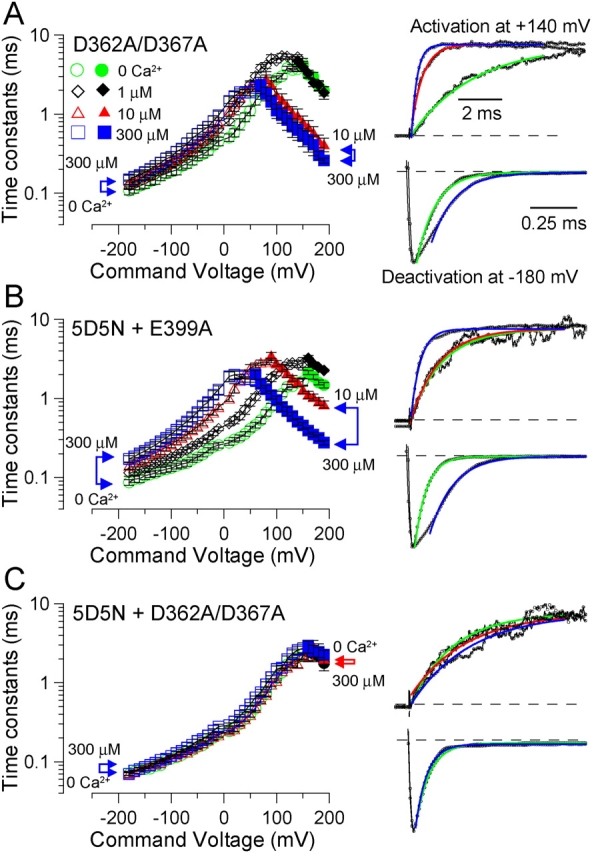 Figure 6. . The D362/D367 site slows deactivation and accelerates activation in the range of 10 to 300 μM Ca2+. Activation and deactivation time courses were determined as in Fig. 5 at 0, 1, 10, and 300 μM Ca2+. (A) Effects of Ca2+ on activation and deactivation time constants are plotted as a function of command voltage for D362A/D367A (n = 6). Open symbols were measured from deactivation protocols and filled symbols from activation protocols. Representative normalized current traces for activation (at +190 mV) and deactivation (at −180 mV) are shown on the right, along with lines showing single exponential fits. Activation time constants: 0 Ca2+ (green), 1.74 ms; 10 μM Ca2+ (red), 0.34 ms; 300 μM Ca2+ (blue), 0.27 ms. Deactivation time constants: 0 Ca2+ (green), 0.104 ms; 300 μM Ca2+ (blue), 0.129 ms. (B) Time constants for the construct with both the Ca2+ bowl and E399 mutated (5D5N+E399A; n = 7) are plotted with representation current traces and fitted exponentials on the right. Activation time constants: 0 Ca2+, 1.22 ms; 10 μM Ca2+, 0.74 ms; 300 μM Ca2+, 0.26 ms. Deactivation time constants: 0 Ca2+, 0.065 ms; 300 μM Ca2+, 0.130 ms. (C) The dependence of activation and deactivation time constants is plotted at various Ca2+ for the construct with both higher affinity sites mutated (5D5N+D362A/D367A, n = 6) with sample traces and fitted single exponentials on the right. Activation time constants: 0 Ca2+, 1.69 ms; 10 μM Ca2+, 1.67 ms; 300 μM Ca2+, 2.91 ms. Deactivation time constants: 0 Ca2+, 0.079; 300 μM Ca2+, 0.631 ms. |