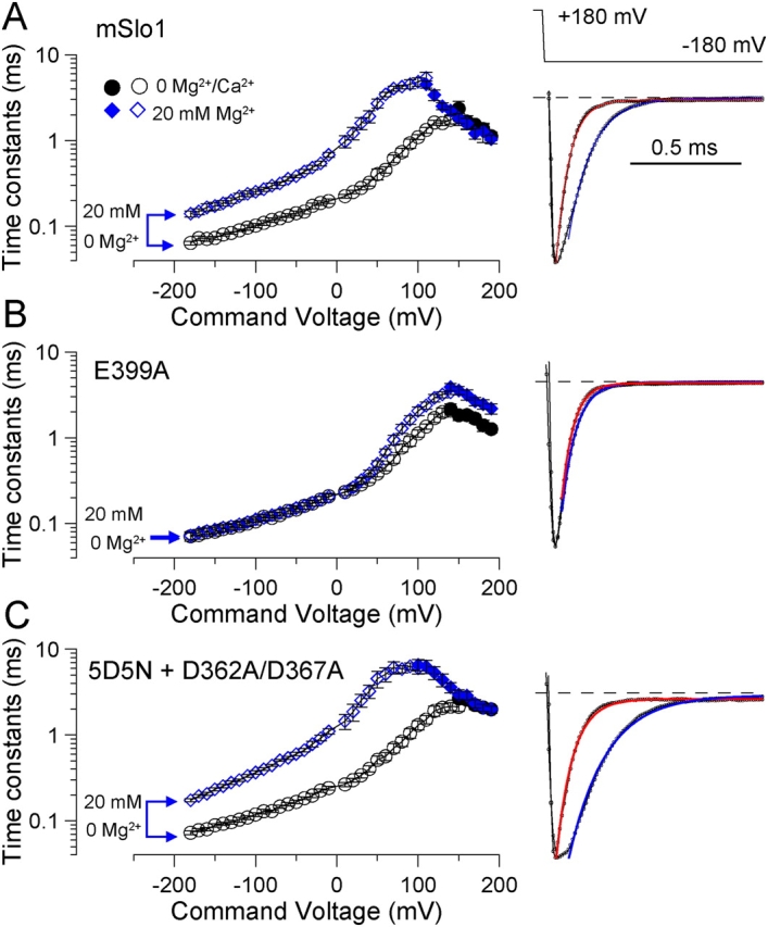 Figure 7. . The E399 low affinity site slows deactivation. Activation and deactivation time courses were determined as in Fig. 5 but either in the absence or presence of 20 mM Mg2+. (A) Effect of 20 mM Mg2+ on activation time constants or deactivation time constants in wild-type Slo1 (n = 6). Open symbols, deactivation; filled symbols, activation. Traces on the right show normalized deactivation currents at −180 mV with either 0 Mg2+ (red fitted line, 0.061 ms) or 20 mM Mg2+ (blue fitted line, 0.107 ms). (B) Effect of 20 mM Mg2+ on activation and deactivation time constants with the E399A mutation (n = 7). Traces on the right are as in A. τd: 0 μM Mg2+, 0.055 ms; 20 mM Mg2+, 0.066 ms. (C) Effect of 20 mM Mg2+ in the construct with both higher affinity sites mutated (5D5N+D362A/D367A; n = 7). Traces on the right are as in A. τd: 0 μM Mg2+, 0.076 ms; 20 mM Mg2+, 0.170 ms. Circles, 0 μM Mg2+; diamonds, 20 mM Mg2+. |