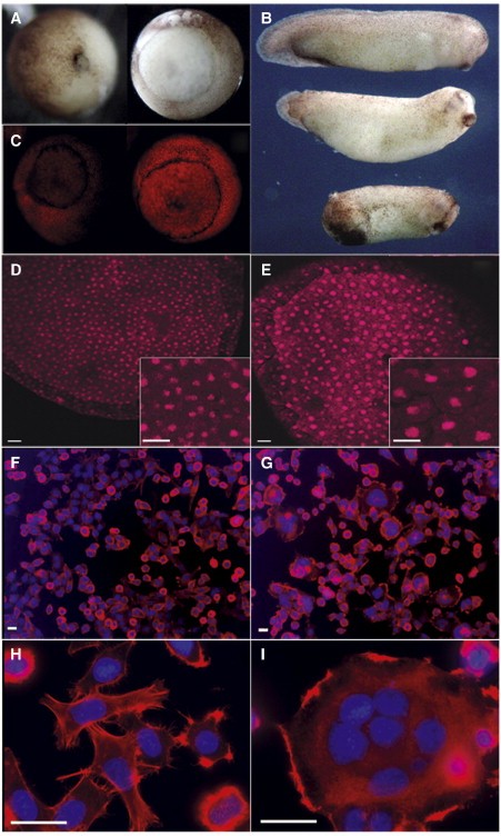 Figure 3. Downregulation of Mat89Bb Disrupts Development and Cell Cycles of Xenopus Embryos and Mitotic Divisions of Cultured Mammalian Cells(A) Injection of Mat89Bb morpholinos in Xenopus embryos leads to developmental delay, with gastrulation defects and polyploidization. (A) Embryos injected with Mat89Bb morpholinos at the one-cell stage appear morphologically to be at (right panel) stage 10.5, whereas age-matched siblings similarly injected with control morpholinos are at (left panel) stage 26. Embryos injected with Mat89Bb morpholinos ([B], bottom) show defects consistent with disruption of gastrulation (e.g., shortened anterior-posterior axis) that are rescued ([B], middle) by coinjection of human Mat89Bb-GFP RNA. ([B], top) An uninjected embryo is shown for comparison. (C) Embryos injected with (right panel) Mat89Bb morpholinos have a greater intensity of DNA staining than (left panel) control morpholino-injected embryos at a similar stage of development. (D and E) Animal caps dissected from (E) Mat89Bb morpholino-injected embryos have larger nuclei than caps from (D) control morpholino-injected embryos; a corresponding increase in cell size is apparent in caps kept flat under a coverslip bridge and viewed at higher magnification (compare insets). Each bar represents 50 μm.(F) RNA interference of human Mat89Bb in HeLa cells results in a multinucleated phenotype. (F and G) Low and (H and I) high magnification of stained HeLa cells fixed at day 6 postinfection. (G and I) Infection with lentivirus encoding Mat89Bb shRNA results in cells with multiple nuclei. (F and H) Cells infected with control virus encoding luciferase shRNA appear normal. DNA is blue, and actin is red. Each bar represents 10 μm.