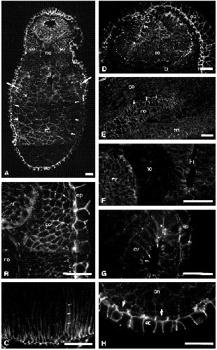Fig. 10. Distribution of a-catenin in the stage 27 tailbud embryo. (A) Transversal section showing staining patterns in different organ anlagen, particulary in the neural tube, pronephros anlage (arrows) and lateral plate mesoderm (arrowheads). (B, C, F, G and H) Details of transversal sections; (D,E) details of parasagittal sections. (B) Somite, arrows indicate the inhomogenuous staining pattern around the somite cells. (C) Cement gland, arrows point at a lateral plasma membrane of a columnar cell. (D) Eye vesicle. (E) Notochord, plasma membranes bordering the basal lamina are indicated by arrows. (F) Neural crest cells are unstained. (G) Ear vesicle, junctional concentrations of a- catenin are indicated by arrows. (H) Ventral epidermis, cell membranes of the bilayered epidermis adjacent to the basal lamina exhibit only weak staining (arrows). en, endoderm; ep, epidermis; ev, ear vesicle; ey, eye vesicle; le, lens placode; nc, neural crest cells; no, notochord; nt, neural tube; pi, pigment layer; re, retinal layer; so, somites. Same histological procedure as in Fig. 7. Bars: 50 um. |
