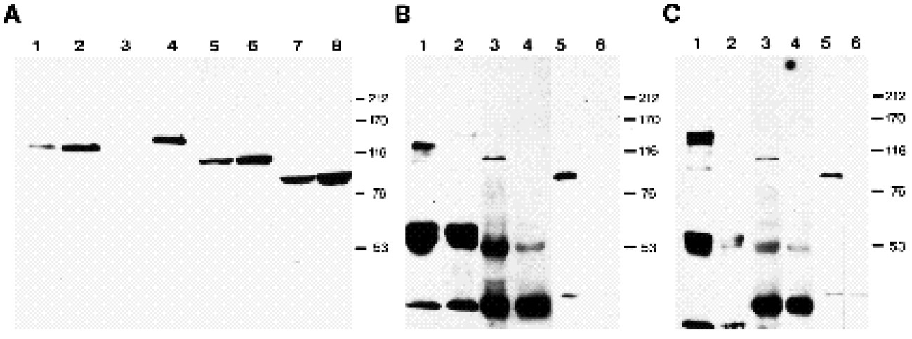 C (lanes 2, 4, and 6), mock precipitates using an inert IgG were used for electrophoresis. The strong signals in the lower part of B and C