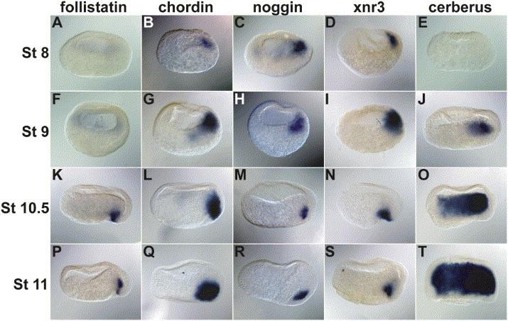 Figure 1. BMP Antagonists Are Expressed in Spemannâs OrganizerBlastula and gastrula embryos were bisected, stained, and then cleared to visualize expression of follistatin (A, F, K, and P), chordin (B, G, L, and Q), noggin (C, H, M, and R), xnr3 (D, I, N, and S), and cerberus (E, J, O, and T) at midblastula (AâE), late blastula (FâJ), early gastrula (KâO), and midgastrula (PâT). Dorsal is to the right with the animal pole toward the top of the figure. St = stage. |