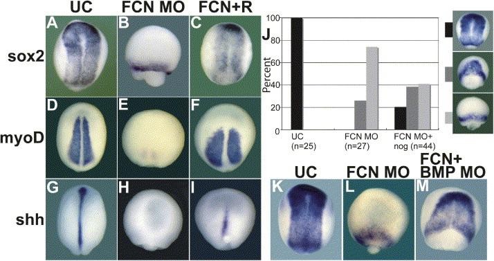 Figure 4. The Phenotype of the FCN Triple Morphant Is Specific to a Loss in BMP AntagonismAll panels are dorsal views of neurula embryos (st 14) with anterior to the top. Triple morphants were subsequently injected with pufferfish noggin mRNA (C, F, and I) and show substantial rescue of dorsal structures (sox2 [AâC], myoD [DâF], and shh [GâI]) when compared to triple morphants (B, E, and H) and uninjected sibling embryos (A, D, and G). The distribution of phenotypes seen in these rescue experiments is depicted in a bar graph (J). The vertical axis is the percent of embryos that show a particular phenotype. The horizontal axis shows the experimental groups and the phenotypes seen. The black bar depicts the percentage of embryos with a substantial neural plate, the dark gray bar depicts the percentage of embryos with a minor neural plate, and the light gray bar depicts the percentage of embryos with no neural plate that show only a ring of sox2 expression. We also tested the phenotype of the triple morphant for specificity by subsequently injecting BMP4,7 MOs (BMP MO), which should reduce BMP signaling. A partial rescue of the neural plate is seen (M) compared to triple morphants (L) and uninjected sibling control embryos (K). |