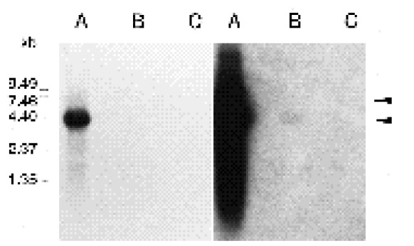 μg) total RNA in lanes A, B and C, respectively. The blot was