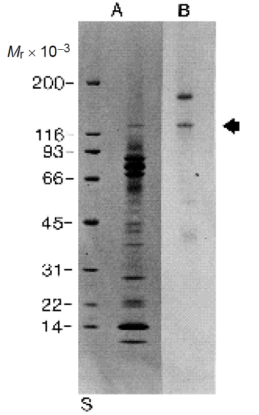and the fluorogram in B. Arrow corresponds to 124´10-3 Mr. |