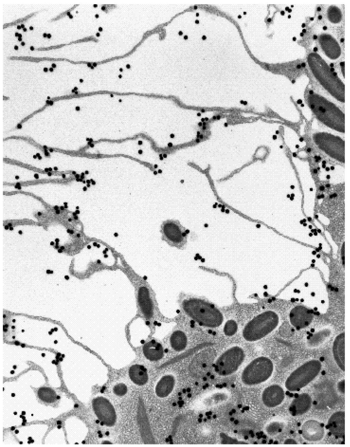 demonstrating grains within the neural retina, pigment epithelium and surrounding outer segments. (B) The neural retina was gently