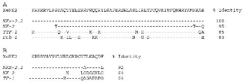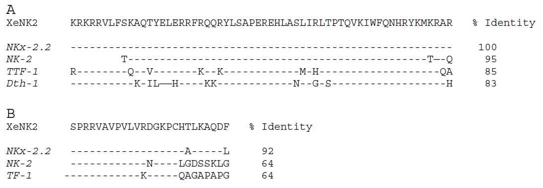 region (A) and the NK2 box (B) between XeNK2 and the murine Nkx2.2 gene (Price et al., 1992), the Drosophila NK2 gene (Kim and