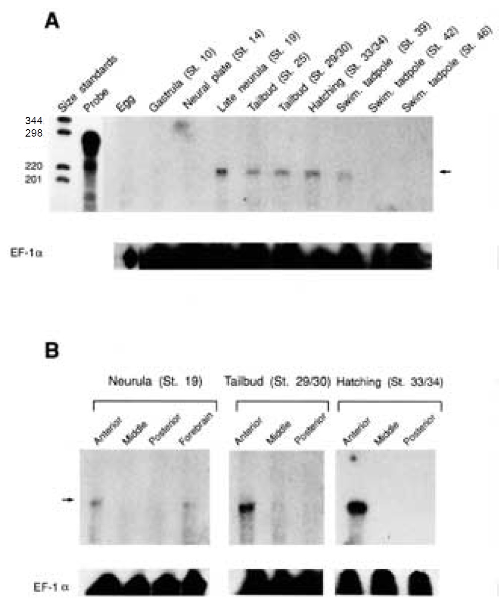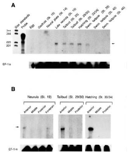 until late neurula stages. Twenty pieces of tissue were used in each lane. See text for details. Protected fragment is indicated by an arrow.