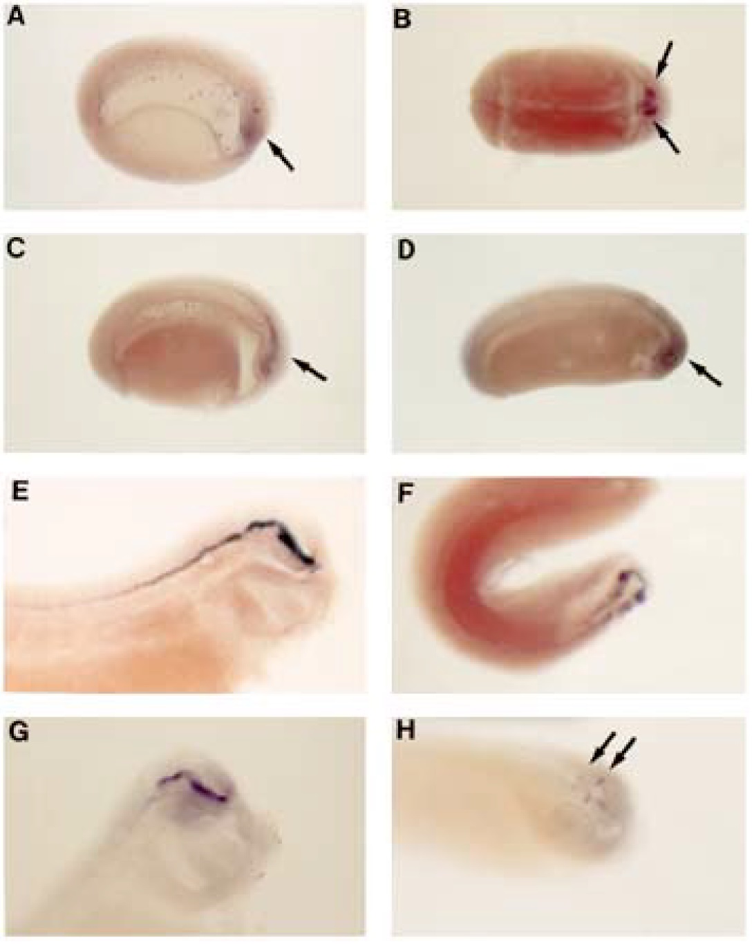 visible in H. In all cases, XeNK2 hybridization signals are denoted by arrows. In all panels, dorsal is up, and ventral down. The