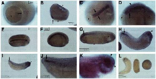 Fig. 5. Spatial expression of integrin a 3 mRNA. Whole-mount in situ hybridiztion was performed on albino Xenopus embryos using digoxigenin-labelled a3 antisense (A-K) and sense (L) transcripts. Hybridization signal visualized as alkaline phosphatase chromogenic