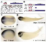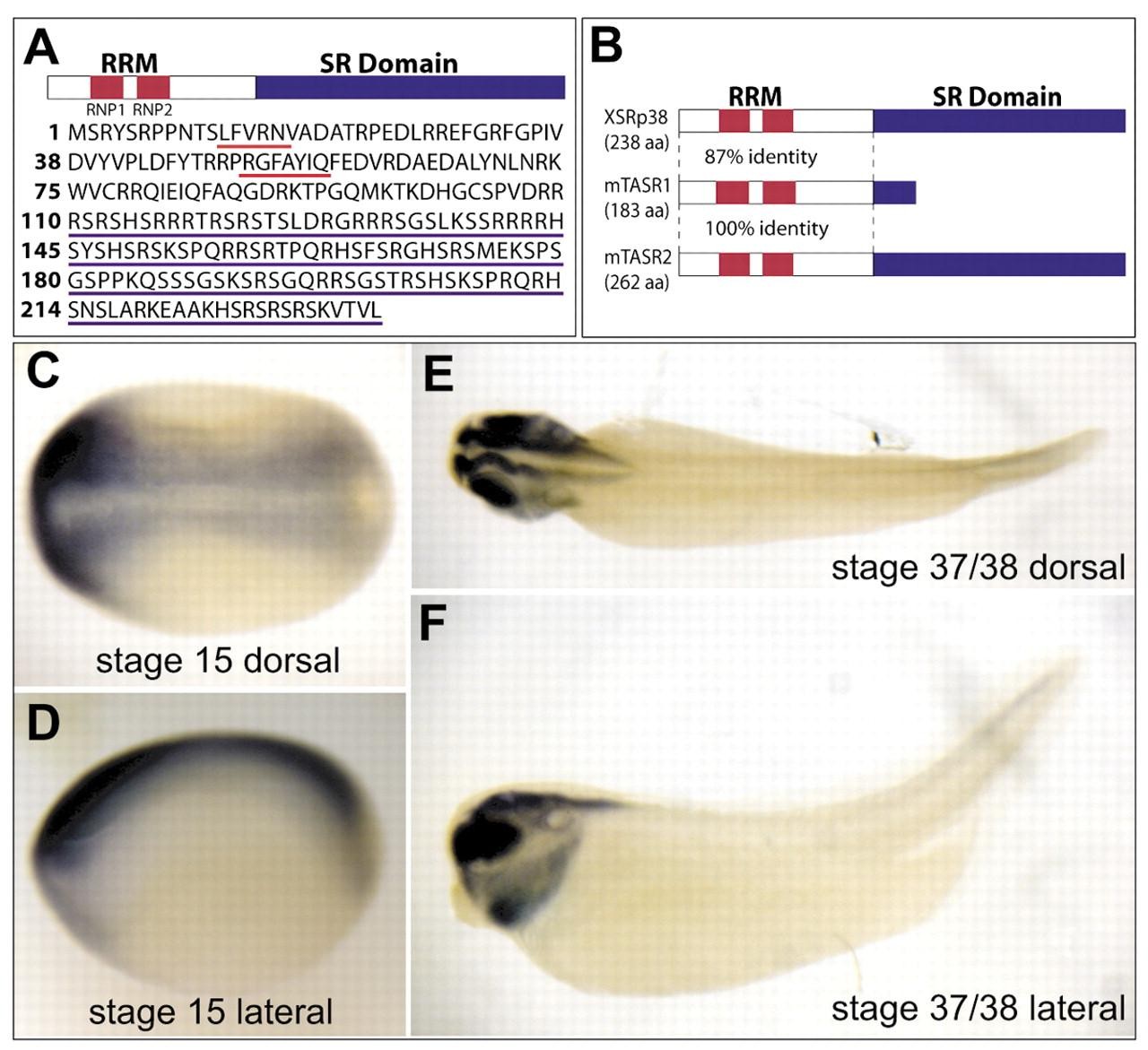 Fig. 1. Sequence and expression pattern of SRp38. (A) Schematic diagram of SRp38. SRp38 is a 238 amino acid protein with an N-terminal RNA recognition motif (RRM) containing two conserved ribonucleoprotein (RNP) domains and a C-terminal serine-arginine rich (SR) domain. RNPs are underlined in red and SR domain is underlined in blue. (B) The RRM of SRp38 is 87% identical to that of the mouse SRp38 isoforms (TASR1 and TASR2). The SR domain is low complexity and the homology drops considerably in this region. (C-F) Expression pattern of SRp38. (C,E) Dorsal view. (D,F) Lateral views. (C,D) At stage 15, SRp38 is expressed diffusely throughout the neural plate. (E,F) At later stages, SRp38 is expressed in the anterior of the embryo, throughout the neural tube, eyes and branchial arches, and surrounding the otic vesicle.