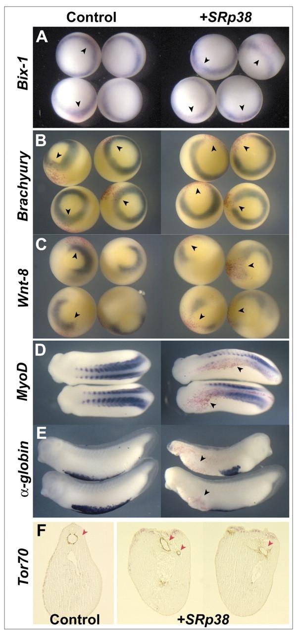 Fig. 3. SRp38 can inhibit mesodermal differentiation. Control embryos on left. SRp38 injection (250 pg each) on right. Some embryos are also stained for lacZ activity (in red) as a lineage tracer. All injection sites are marked with black arrowhead. (A-C) Early mesoderm injections were targeted toward ventral domains. In situ hybridization for Bix1, stage 9.5 (A); brachyury, stage 11 (B); and wnt8, stage 11 (C). SRp38 injection (250 pg each, right) does not inhibit expression of Bix1 but does inhibit expression of Brachyury and wnt8. (D) In situ hybridization for myoD, stage 25. Dorsal injection of SRp38 (250 pg each, right) inhibits expression of myoD at the site of injection (marked by red tracer). (E) In situ hybridization for α-globin, stage 25. Ventral injection of SRp38 (250 pg each, right) inhibits expression of α-globin at the site of injection. (F) Tor70 antibody reveals disrupted notochord development in embryos injected dorsally with SRp38 (two sections on right, notochord indicated by red arrowhead).