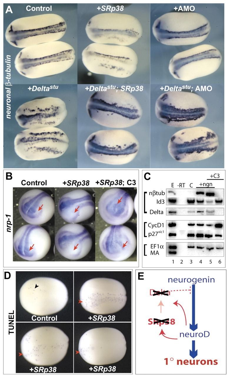 Fig. 6. SRp38 is required for regulated neurogenesis. (A) Dorsal views, in situ hybridization for neuronal specific β-tubulin. Top, left to right: control embryos show expression of β-tubulin in neurons and trigeminal ganglia; SRp38-injected embryos show a loss ofβ -tubulin-expressing cells; injection of antisense morpholino oligonucleotides (AMOs) does not perturb expression ofβ -tubulin. Bottom, left to right: inhibitory Delta (Deltastu) injection results in increased and disorganized expression of β-tubulin; co-expression of Deltastu and SRp38 results in almost normal embryos (compare with +SRp38 above); co-injection of Deltastu and AMOs results in increased expression of β-tubulin (compare with +AMO embryo above and to controls). (B) In situ hybridization for nrp1, dorsoanterior view, stage 17. Left: control embryos show nrp1 staining in the neural plate and eyeprimordia. Middle: SRp38 overexpression inhibits expression of nrp1, red arrows. Right: co-injection of SRp38 with the function-blocking sequence C3 rescues expression of nrp1, red arrows. (C) RT-PCR analysis on animal cap ectodermal explants. Expression of 100 pg of neurogenin in the animal cap results in expression of neuronal β-tubulin and a mild decrease in Id3 (lane 3). Co-expression of neurogenin and 5ng of C3 results in a greater increase of neuronalβ -tubulin and concomitant decrease in Id3 (compare control lane 5 with lane 3). C3 alone (lane 6, 5 ng) results in complete loss of Delta and no effect on Id3 expression. CyclinD1 and p27xic1 expression are unchanged in neuralized explants upon addition of C3 (compare lane 5 to lane 4). (D) TUNEL staining indicates apoptotic cells. Dorsal views of stage 15 embryos. Control embryos show very few TUNEL-positive cells (black arrowhead), while embryos injected with 250 pg of SRp38 RNA in one cell at the two-cell stage show a variable, though clear increase, in the number of TUNEL-positive cells (red arrowheads). (E) Primary neurogenesis is increased in the absence of SRp38 and Delta function.