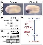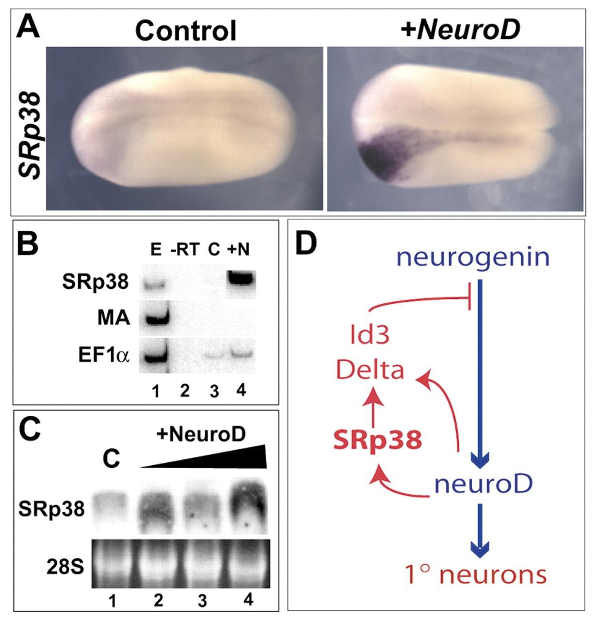 Fig. 7. SRp38 is induced by neuroD. (A) Dorsal views of SRp38 expression are pictured at stage 21. Left: control. Right: injection of 250 pg of neuroD into one cell at two cell-stage induces robust expression of SRp38. (B) RT-PCR on ectodermal explants. Injection of 250 pg of neuroD (+N) induces expression of SRp38. EF1α is a loading control and muscle actin (MA) controls for mesodermal contamination. (C) SRp38 northern blot on total RNA in embryos overexpressing increasing doses of neuroD (125 pg to 500 pg) results in increasing amounts of SRp38 RNA. (D) SRp38 is itself regulated by neuroD, suggesting it is a component of a neuroD-induced mechanism serving to limit neurogenesis.
