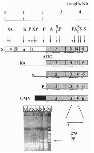 Characteristic restriction sites (S, Sac I; X, Xho I; A, Acc I; K, Kpn