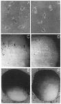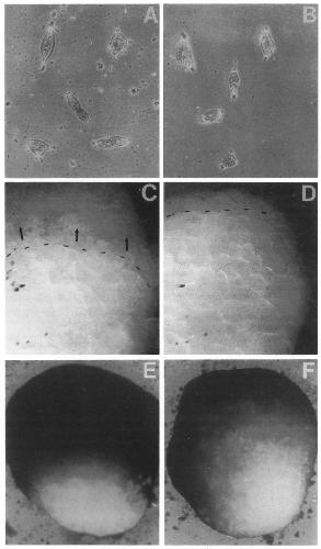 Figure 7. gsc Affects Cell Movements in Groups of Cells but Not in Individual Cells (A and B) Deep zone cells from the ventral (A) or the dorsal (B) side of early gastrula embryos were dissociated, seeded on a fibronectincoated dish (200 @ml), and recorded by timelapse microscopy. A single frame of the recordings is shown. Note that both cell populations are spread and extend filopodia with which they move. Dorsal and ventral cells, as well as gsc-injected ventral cells. failed to show any differences in their ability to move on fibronectin-covered plates in these time-lapse recordings. (C and D) A 16cell stage embryo was injected into each vegetal blastomere with gsc mRNA (0.5 ng each). At the late blsstula stage (stage 9) a ventral marginal zone explant was prepared and recorded by time-lapse microscopy using epiillumination. Single frames soon after explantation (C) and after incubation for 3 hr (D) are shown. Animal pole is at the top. Note the flat and bright cells that lie on top of each other and have migrated toward the animal pole in (D). In the time-lapse film, these cells can be seen to slide on each other, resembling shingles on a roof. The ventral side was assigned by inclination and Nile bluesulfate labeling before first cleavage (Steward and Gerhart, 1990). (E and F) Embryos at the l&cell stage were coinjected into each vegetal blastomere with fluorescent lineage tracer (FDA) and either 0.5 ng of Agsc (E) or gsc mRNA (F). Ventral marginal zone explants were prepared from early gastrula embryos and scored after 2.5 hr incubation for migration of labeled cells in an epifluorescence microscope. Owing to injection into vegetal blastomeres, the animal cap cells remain unlabeled, while most of the label is in mesodermal and endodermal cells. Note extensive covering of the animal cap tissue by fluorescent gsc-injected cells in (F). In three experiments that have been scored blind by an uninformed observer, 53% (n = 32) of the gsc-injected explants underwent mesodermal cell movement compared with 9% (n = 24) in Agsc-injected explants. |